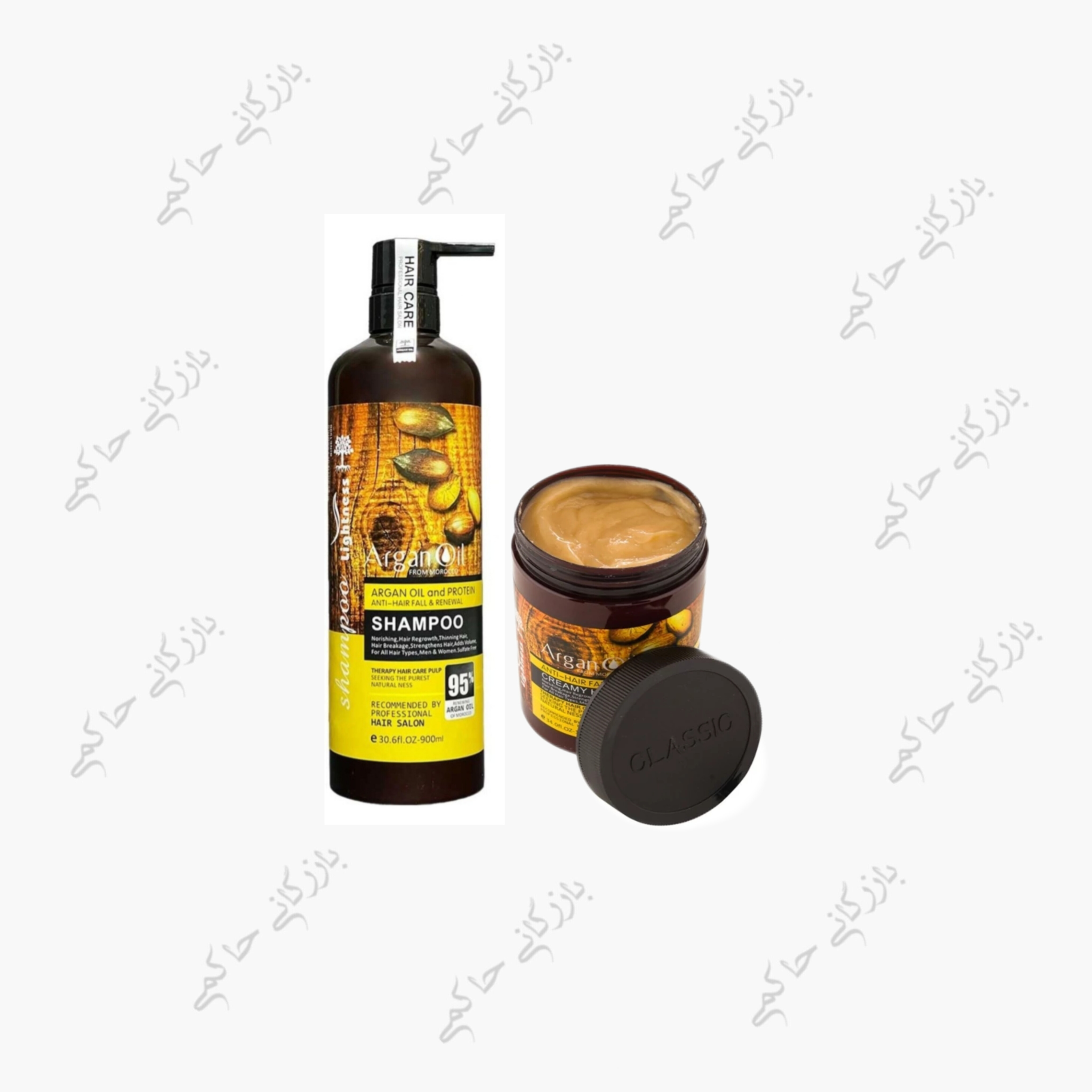 پک شامپو و ماسک مو آرگان اویل برند لایتنس(واردات قانونی جلفا) ضد ریزش و بازسازی با روغن آرگان حجم ۱۰۰۰ میلی‌لیتر | دارای قیمت عمده برای خریداران عمده